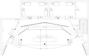 El escenario tiene aproximadamente 13 metros de ancho por 6 metros de produndidad de acuerdo a lo que muestra el siguiente plano. Cuenta con un telón de 8,5 metros de ancho. En su parte posterior, tiene dos camarines equipados, pero sin baño.